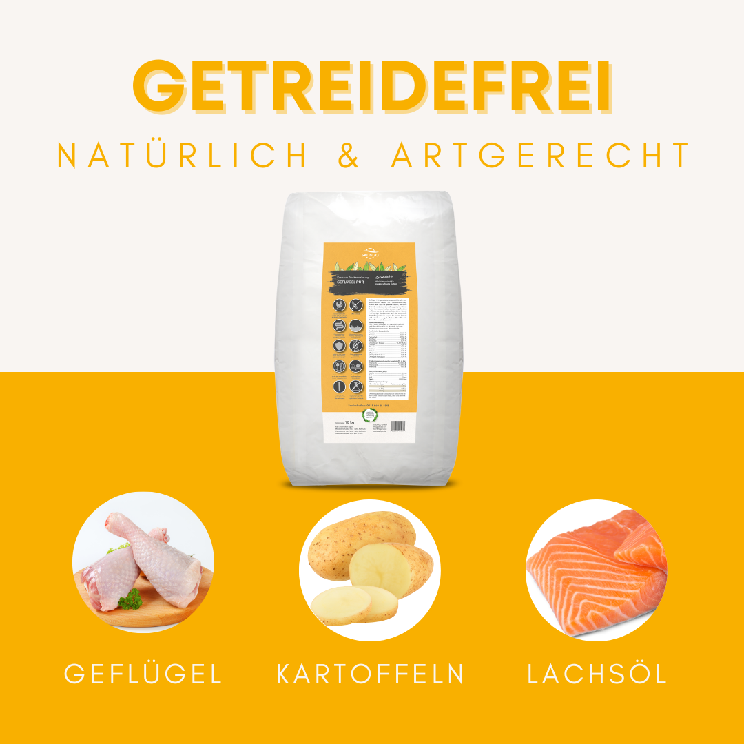 La viande de volaille, en composition mono-protéiprotéine, est facilement digestible et assure une tolérance optimale des aliments. Dans nos croquettes, nous évitons les céréales et utilisons plutôt des pommes de terre fraîches comme source de glucides. Comparées aux céréales, elles sont mieux tolérées et provoquent moins de réactions allergiques.